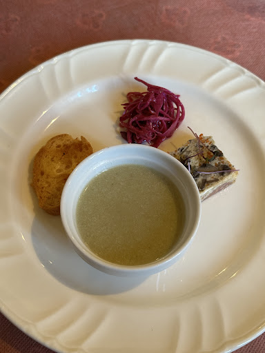 Read more市内在住の方のブログで拝見してお店を知りとても興味を持ち、予約無しで伺ったのですがその日はあいにく満席とのことで入店出来ず…。 日を改めて予約して伺ってみました。 クチコミなどを参考に、何を食べるか何となく決めてはいたのですが、その日はキッシュランチがお休みで、キッシュか?煮込みと思っていたので、煮込みを選択。 若鶏と山ごぼうのクリーム煮と思っていたのですが、実際メニューを拝見すると、おぐにビーフの煮込みと迷いました。 迷いに迷って、来店前から決めていた若鶏を注文いたしました。 前菜から始まり食べ終えたタイミングで、一皿ずつ配膳されます。 恥ずかしながら、お作法とかあまり分からないので自己流となってしまいました。 最初に配膳された前菜は、十勝マッシュルームのテリーヌと蕗のとうのポタージュでした。 ポタージュは、器を手で持って香りを楽しんでみてくださいとのことでした。 蕗のとうのあとから追いかけてくるような苦味が苦手なのですが、ほんのりと苦味はありましたが追いかけくる感はなかったので、飲みやすくて美味しかったです。 食いしん坊の私は、もう少しお腹を満たしたいなら、パスタランチの方が良いかなと思いました。 キッシュも気になりますし、パスタメニューが豊富で、ケーキも迷うほどどれも美味しそうだったので...