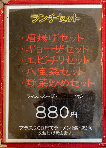 Read moreお店の前に5台駐車場あります なかなかの人気店のようでタイミングが合わないと待つしかありません 店内はカウンター、テーブル席、お座敷があります こちらでピリ辛あんかけラーメン、エビエビあんかけ焼きそば、坦々麺、あんかけ焼きそば、えびみそ味噌ラーメン、唐揚げ注文 フライパンの炒める良い音を聞いてるうちにアッという間に着丼!! なかなかの早さで腹ペコには助かります ピリ辛ラーメンは全体に餡でして最後までトロリ 海鮮、野菜と具沢山でして麺は細い方なのかな⁈餡が絡んでとても美味しかったです 辛味も名前の通りピリ辛なんで意外とお子さんでもいけそうな感じです エビエビあんかけ焼きそば、エビみそ味噌ラーメンはしっかりエビの味がします エビの食感は好きだけど風味?匂いが苦手な人には好みが分かれるかも知れません 坦々麺は山椒の良い香りなんですが甘めです 唐揚げはそのままでも美味しい!のですがせっかくタレもあるので味変 タレは唐揚げの味を邪魔するわけでもなく劇的に変えるわけでもない感じでした 次回はご飯もの頂きたいです! 再訪、セット物が食べたくて間を開けずに訪問 日替わりからと平日セットを頂きました! 平日セットは200円足してラーメンへ変更 塩ラーメンは少し塩味が強く感じました が、スープの出汁?とても美味しく中華屋さんの味でした 醤油も一口目は???と、思いましたが食べ進めるうちに旨味を感じ美味しかったです エビチリは甘かったです 溶き卵と揚げ玉?何かカリッジワっとするのが入ってました 辣油を足しましたが辣油も甘く、もう少し辛くても良いかなあと...