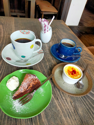 Read more昔ながらの木の温かを感じられて、天井は高く開放感のある空間でした。 コーヒーとケーキのセット¥950を2つ注文。 1つはブレンドとガトーショコラ、1つは薄いコーヒーとクレームブリュレを選びました。