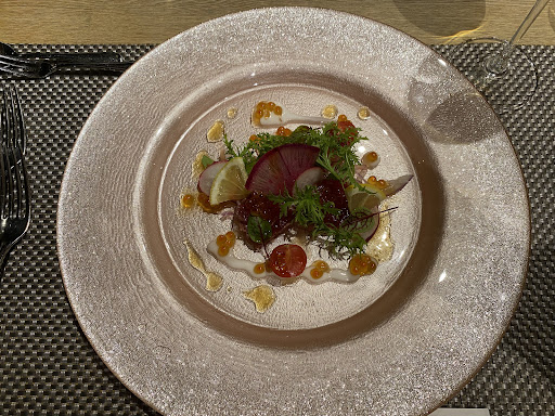 前菜の鮪の炙りは、とてもバランスの取れた味で、鮮度の高いマグロにフレンチソースが非常によく合いました。マリネされた野菜との相性も問題ありません。 食べ終わる頃、スープが出てきました。玉葱と北海道産男爵いものポタージュとのこですが、こちらは滑らかですが平凡な味でした。そしてびっくりしたのがまだスープを食べ始めて間もないのに次の料理を持ってきたことです。ホテルのレストランのコース料理で、まだ食べているのに次の料理を持ってきたのは初めてのことです。何か焦らされているような気分になりました。 次に出てきたオマール海老については丁寧に火入れされており、味付けも申し分ありませんでしたが、メインの牛フィレ肉については火の通し過ぎでややウェルダンになっており、淡白なフィレ肉の水分が抜けてしまいパサパサになっていました。 別注でシェア用に注文したアクアパッツァも、魚の身が固くなってしまっており、チキンのグリルも火の通しすぎでパサパサになっていました。