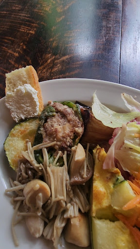 前菜盛り合わせ 全部美味しいです。10種類以上あって、次は何を口に運ぼうかと思いながら食べるとむしろ楽しいです。いつも入ってるイメージなのはピーマンの肉詰め→挽き肉が旨いです。ナスの甘酢煮→ソースと食感が良いです。ニンジンシリシリ→甘みと塩味と酸味のバランスが良いです。キッシュ→卵多めです。あとはズッキーニ、キノコがある時が多いですね。今日はバジルチキンがありました。その時によってはカブとかゴボウとかある時があります。楽しみですね。