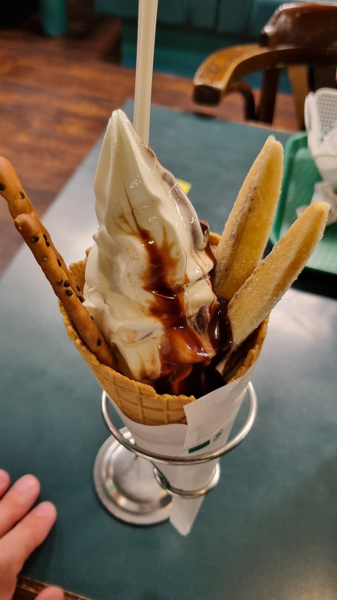 Honestly, considering it's labelled as a fast food chain, I'd still recommend to check it out if you're visiting Hakodate (or Hokkaido in general). Apparently it's an exclusive chain that only exists in Hokkaido. The interiors are somewhat western-inspired, but it's still more interesting than any western fast food chain (McDonald's etc), and I think it has a very peculiar style. I ordered the most popular Chinese fried chicken burger and was totally satisfied. I had it as part of a set with fries and tea, but I'm not a big fan of fries, and I didn't like them much, they were too soft and not crunchy at all. Also, the tea is just a regular ice-cold tea, the same one you're served with in other Japanese restaurants, so nothing special. I'd rather recommend getting one/two burgers (depending on how much you're hungry) and the guaranà drink. If you're up for a sweet treat, they also serve soft creams with various toppings. I had the banana and chocolate one and enjoyed it a lot. I think this shop gets less attention than its neighbour in the bay area, so make sure to check this out if the other one gets too crowded, otherwise I bet they're identical. Last but not least, it's...