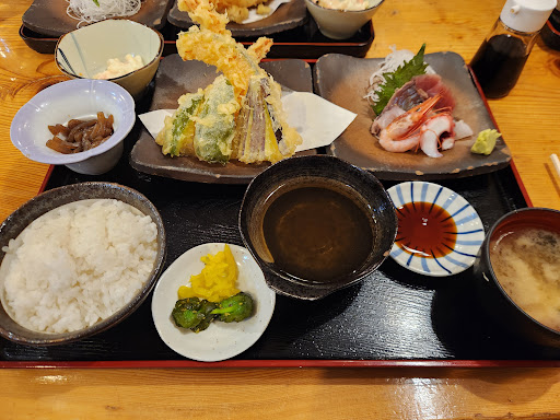 We ordered the tempura set, grilled fish set, French fries, fried cheese potatoes and draft Asahi beer.