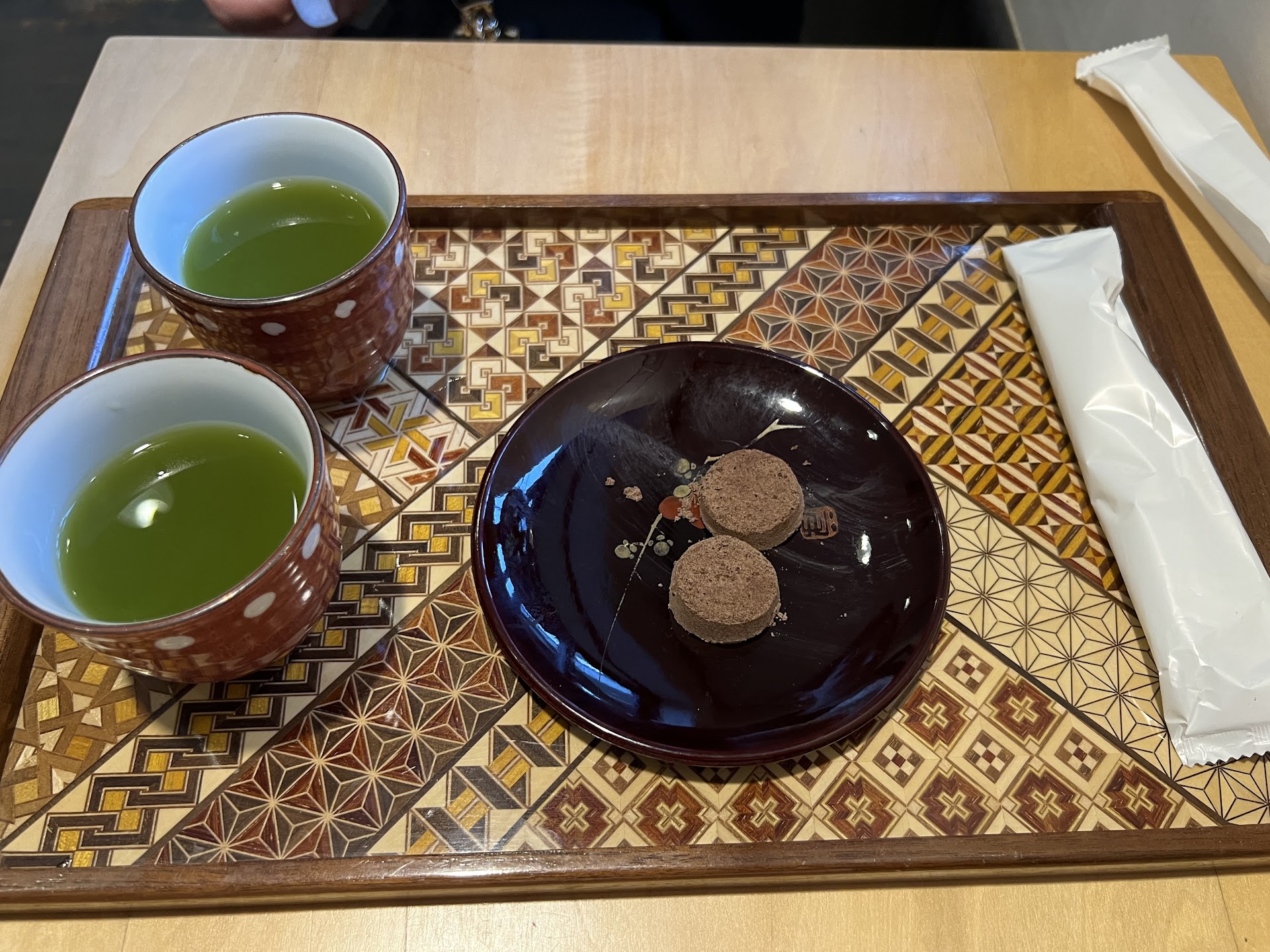The wagashi came out beautifully plated and the owner, Aki, explained each flavor. He was very friendly and provided refills of tea and chatted using google translate. He also gave some free little art print sheets and a little origami as a gift. It was beautiful and warmed my heart. Very sweet and accommodating.