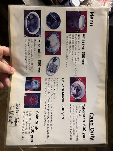 Upon entering, you're greeted by the rich aroma of freshly prepared treats and the crackling of a traditional hearth. The interior exudes rustic charm, with tatami seating and wooden beams, creating a cozy ambiance perfect for relaxation. The highlight of the visit is the Amazake, a non-alcoholic, naturally sweet rice drink served warm with a hint of ginger. Priced at ¥400, it's both nourishing and comforting, especially on chilly days.