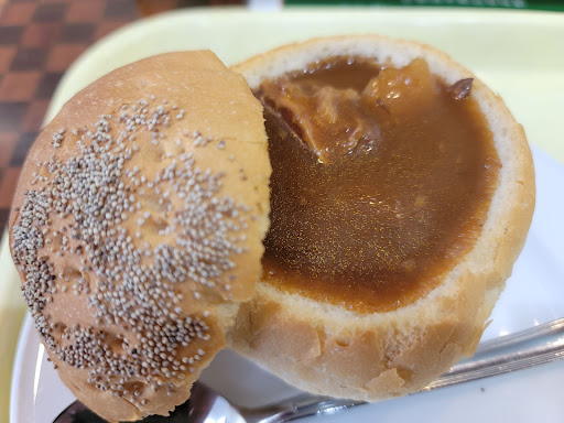・器としてのフランスパンにまぶされた胡麻、いかにもカリッとしていそうなパン。この時点で生唾ものです。パンの上蓋を開くと、シチューにつかり切らない、まるで半身浴でもしているかのようなビーフがこんにちわ。そそりますねぇ。