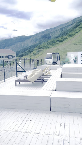 Nice terrace with views of the surrounding mountains viewed through clear plastic walls when sat on the deckchairs, beach loungers or beam bags available. Menu is very limited for vegetarians (just french fries (¥700) as far as I could tell) and beer selection is limited to bottles of Corona (¥700) and Hoegaarden. Still, a nice place to enjoy a cold one after some time on the mountain. Quite a few people seemed to bring up ice cream etc purchased from the places downstairs and sit up on the terrace without being told to leave. There is also a private tent sauna and jacuzzi area...