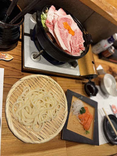Ordered the sukiyaki with udon and 2 raw eggs (a must for dipping), 2 orders of salmon sashimi bc it was so good with their wasabi, a super tender and flavorful yakitori and their prawn tempura special. The sukiyaki broth was not overly sweet or concentrated and was served with A5 Wagyu already which melted in our mouths.