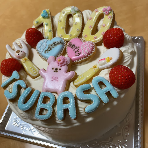 子供の百日祝いのケーキを作っていただきました。 こんな感じにしてほしい、というイラストと、イメージ写真を見てもらい、予想よりとてもとても可愛らしいケーキを作ってくださいました。食べるのがもったいなかったです。味も、ケーキもクッキーもとても美味しい( ◠‿◠...