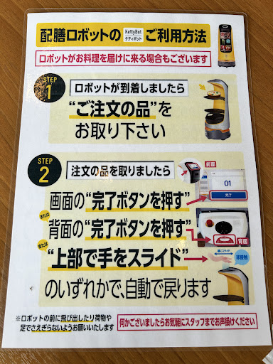Read moreお昼11:30頃に行きました。 12:00を過ぎると満席の場合があるほどいつも賑わっています。 店内は清潔感があり広々としています。 注文はタッチパネル式になっていました。 配膳ロボットが爽やかな音楽を鳴らしながら移動していて可愛いです。 商品は配膳ロボットが届けてくれたり、店員さんが持ってきてくれたりと臨機応変に動いているようです。 ランチに『ヤリイカと明太子のパスタ』を食べました。辛さ控...