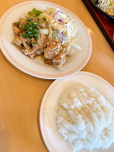 料理は焼き肉と唐揚げのセットをお願いするとほとんど皮ばかりの唐揚げはガリガリ硬く、ほんのひとくちついていた焼き肉はチリチリに炒められ、玉ねぎはほとんど生の状態 申し訳ないですがほとんど食べられませんでした。