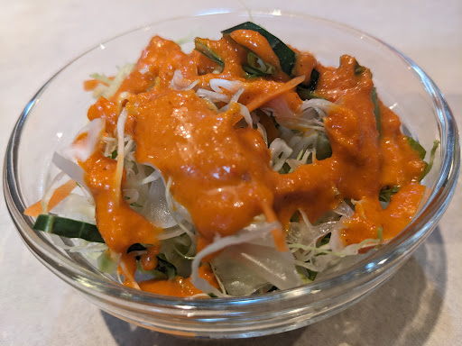 サラダは、キャベツやきゅうりが入っていましたが、ドレッシングの色が濃くて、鮮やかな赤茶色、味は、人参をベースとしているらしく、初めて食べる優しい味のドレッシングでした。