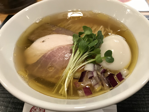 Read moreあっさり系のラーメンと聞いて行くことに。外のベンチで15分ほど待って入店。だしそば丸鶏醤油に780円のと880円のと980円の食券があり、何が違うのかサッパリ分からず、オススメと書いてあった980円の食券を購入。 麺は中華麺の感じはなく、そば粉が全く入っていない日本そばという感じ。コシがしっかりある。 スープは私にはちょっとくどかった。胡椒をかけたら若干サッパリしたけど、沖縄そばに入れるコーレーグースでも置いといてくれればもっとアッサリ食べられたかなと思う。麺よりご飯入れて食べたい感じ。(ご飯の食券もあったけど、お腹いっぱいになっちゃったので。) チャーシューが『火を通した鶏むね肉がこんなに柔らかいなんて事あり得る…?』ってくらい柔らかくて驚いた。 あと海苔がめちゃめちゃおいしかった。次回はトッピングで絶対追加する。ネギとカイワレのトッピング追加の食券も作って欲しい。 店内はジャズとラーメンをすする音しか聞こえないほど静かで、外のベンチで待ってた時は色々おしゃべりしてた男性客2名も、店内ではお互いに何も話してなかった。そういう雰囲気がある。 1人で行ったけどカウンター席しかないし、入りやすかった。次は掛川茶のラーメンを頼んでみたい。あと月、金、日休みでランチ営業のみっていう強気...