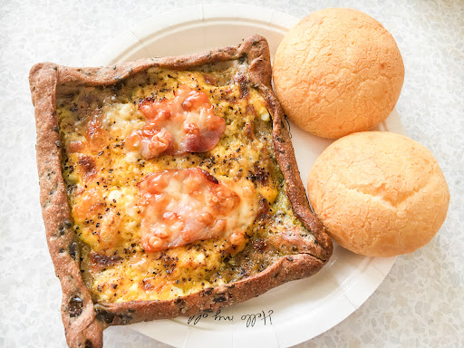 コロナ対策 今現在はコロナの影響の対策として、2組までがお店に入りパンを選ぶ事が出来る状態でした。 中で選んでる方達以外は、店ドア前の案内に従ってソーシャルディスタンスを保ちながら外で待ちます。 今回購入したパン ☆ポンデケージョ 60円 もっちもちでコロンとしたフォルムが可愛い。 ポンデケージョ好きさんにはもちろん、小腹が空いた時にも良さそう。