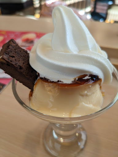 喫茶店のプリンソフトクリーム&ブラウニーは、ブラウニーを一番上のソフトクリームと一緒に食べるとミルクの味が加わって、まろやかになります。