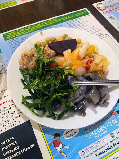 先客は家族連れ2組と2人連れのお客さま、全員がブラジルまたは日系の方がおり、席には余裕がありました。我々が入店後の19:00過ぎに日本人のお客さんが何組か見えていましたが、お席には十分な余裕がございました。 メニューは、すべてのシュラスコが食ベられる「コンプリート」、ピカンニャ (イチボ)は2回·カルビ、チーズ、バイナップルは1回のみの「ミニ」、シュラスコがない「ビュッフェバイキング」の3コースです。お子さまや高齢者には ディスカウント、割引があり家族連れには嬉しい印象です。とりあえず、すべてのシュラスコを楽しみたかったので、「コンプリート」を選びました。お肉はテンポよく運ばれてきて、概ね満足です。ビュッフェもブラジル料理のフェジョン、フェイジョアーダなど日本ではあまり味わえないお料理があり、他のお客さんの雰囲気も含めてプチ海外旅行をした気分が味わえました。