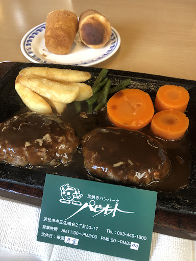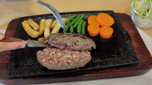 浜松の老舗で、炭焼きハンバーグの祖と言われる程の歴史があるらしく、昔から変わらぬ味を守る老舗のハンバーグを食べてみたーい!と思って、開店から一番乗りでランチしに行くと、店内では、炭焼きハンバーグが運ばれる度に、鉄板で焼き上がる音と、食欲を唆る香りに、お腹が我慢の限界でした。