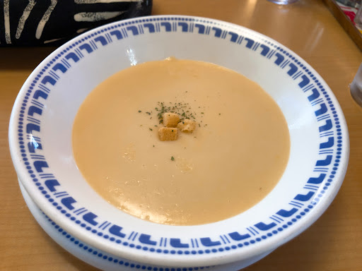 炭火焼きハンバーグにBセット(ライスorパン、コーンスープ、珈琲or紅茶orアイスクリーム)を注文。 まずコーンスープが運ばれてきました。見た目美味しそう。食べてみると塩気が強くコーンの味がまったくしない。どろっとしているのでこれだけでお腹が膨れます。 次にハンバーグ。デミグラスソースを注文。デミグラスソースは10日間煮込んでいてオススメなんだとか。赤みが苦手でよく焼きもできるとのことだったのでよく焼きでお願いしましたが中はかなり赤い...。デミグラスソースは薄くて味があまりしない。連れが食べていたステーキソースを一口もらいましたがそちらの方が味がしっかりついていました。でも少ししょっぱい?仕方なくハンバーグにこしょうをかけて食べました。 パンは中にコーンが入っていてかなり甘め。お菓子を食べている気分。ハンバーグには合わないと思います。もっとシンプルなパンがいい気がします。 最後にアイスクリーム。バニラビーンズが多く入っていて好みが別れると思います。