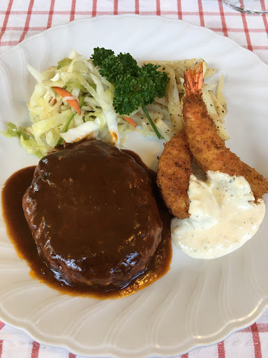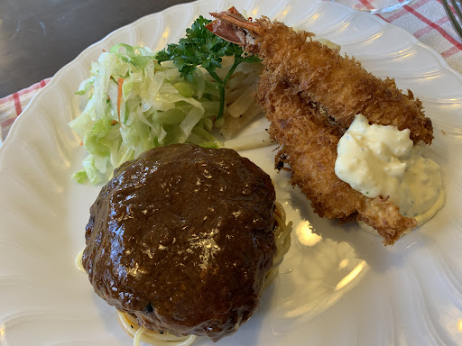 Read more注文 ハンバーグとエビフライにライス 970円 世間の流行は粗挽きだというのに、それを真っ向から迎え撃つようなよく練られたねっとりハンバーグ。柔らかくスパイスがよくきいている。かかっているデミグラスソースもクセのない味わい。ハンバーグは全体的に味は薄めであっさりしている。 プリプリというよりもブリンブリンというのがあっている歯ごたえがあり大きいエビフライもハンバーグとのコントラストが気持ちいい。タルタルソースも優しい味わいでマヨネーズ嫌いの私は好きだった。 付け合せのキャベツの漬物(ザワークラウト?)もちょうどよい味。野菜を食べて肉の罪悪感が薄まるぴったしの量 そこそこ食べられる成人男性でも少しいっぱいだな…と思う...