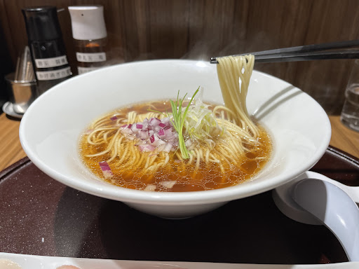 まずはスープをズズッと一口。 うん、ナチュラルかつ上品な塩加減で良き!Good。ではチャーシュー、大山鶏…うーむ素晴らしい。なによりガツン!というパンチの効いた味は求めないからこそ選んだこちらのラーメンでしたので、澄みきった上品な味わいに食べ始めから満足!添えられた芽葱からも上質な味わいをしっかりと感じ取れましたよ。澄んだ味わいだからこそ、素材に拘っているのが感じ取れやすく、良さも味わえる。麺も…うん、甘すぎず軽過ぎさも無く、良き!好みの太さと味!玉ねぎと一緒にスープを飲むも絶妙に辛みは感じなく、変化を楽しめて良きです!