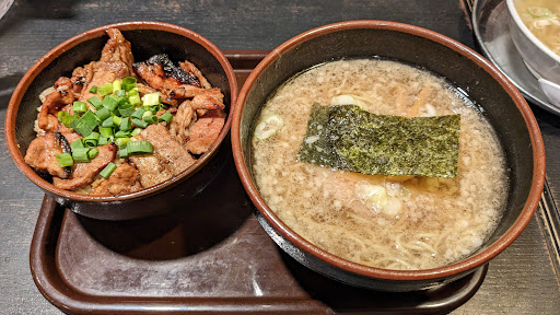 休日の夕飯に家族で訪問。 土蔵のラーメンと笑門の豚丼、つけ麺が同時に味わえるお店。 ラーメンはあっさり目のスープにコクのある背脂が浮いているもので、油の膜がスープを覆っているため最後までアツアツで食べられました。麺は細目のストレートで、スープとの絡みも啜りやすさも良し。 豚丼は炭火で焼かれた2種類の部位が丼を覆う。炭火焼の香ばしさと甘じょっぱいタレがいいコンビネーションだが、肝心の肉は少し火を入れ過ぎなのか全体的に硬く、部位の違いのコントラストもあまり感じられなかった。