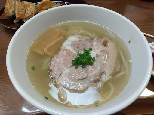 Read more平日のお昼に利用しました。 以前から気になっていたラーメン屋さん。 それは、よく行っていた故郷・栃木県にある地鶏中華そば「阿波家」の、のれん分けのお店がこの「天日地鶏」とのこと。ようやく機会に恵まれ来ることができました。 お昼12:00くらいに到着。お店前の駐車スペースにはすでにたくさんの車が駐車しており、なんとか1台分のスペースを見つけ駐車。 早速お店の中に入ると、カウンター席が空いていたのでそこへ着席。 ランチメニューの「塩らーめん+餃子6個]の1,070円を注文する。 待っている間もたくさんのお客さんが入ってきて人気店なのが伺い知ることができる。 注文してから10分間くらいしてから着丼。 早速餃子を頂くと、小ぶりサイズながらも野菜+ニンニクのタネが良く合い、食欲をそそる。 お待ちかねのラーメンは、透き通ったスープが本家の阿波家を彷彿とさせる感じで 味わうとまさにそのもの。懐かしい味にしばしスープをすする。 塩味だけに、地鶏の味わいを良く感じることができる。 麺は小麦粉の味わいが、噛めば噛むほど良く、スープと良くからみ絶妙なバランス。 つけ添えはメンマとチャーシューとシンプルだが、大振りサイズでジューシーで大満足。 あっという間にスープまで間食。 是非またリピートしたいお店のラーメン屋さんを静岡県に...