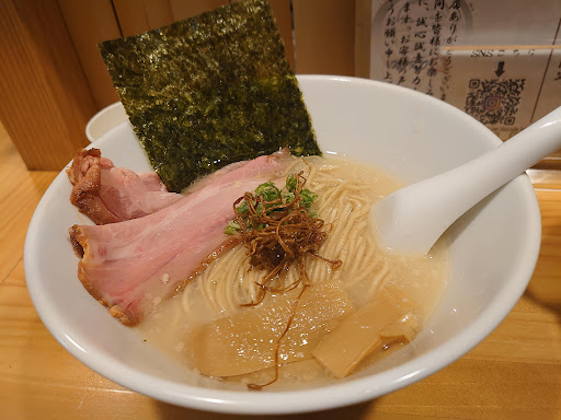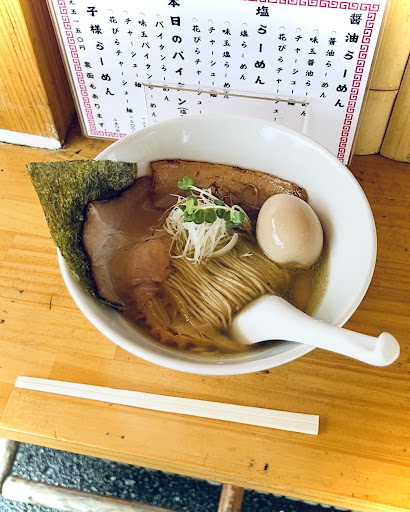 Read more2010〜2016年静岡配属の頃は 浜松で屋台(仮設店)といえば浜松駅近辺を除けば 浜松トラステ→浜名バイパス坪井ランプの身空(ミソラ)か 全国移動の熊本ラーメン大門(袋井のお寺さん)のイメージだった 静岡離任後2021年ごろふと情報に触れようやく2024年8月初利用 葵で営業と思っていたらお店投稿のSNSで和地町桜台方面に移転と判明 取り急ぎ記帳し呼出装置を受け取り車中で待ち呼び出し後は席につき注文 食後精算 トイレは隣のるぴなすの畑というお花屋さんで貸してくれる 味玉塩1000円 味玉つき注文中心だと見越して?釣銭準備が最小限に済むと思われる絶妙?な値付け 給排水設備しっかりな露天キッチンで大将が一生懸命作ってくださる 全体に地味な色目とは思うけど 今日日の盛り付けのポイントを押さえてあり 具を脇に寄せふすま入り麺の線がきれいに見えて既視感あるけれどもシャレオツ 白のどんぶりレンゲとも合っている お味はかなり強烈なホタテ?貝風味が名刺代わり そのあと鶏豚ほか乾物類が静かに下支え 塩気は塩ラーメンらしく輪郭あり 麺はふすま入りでもプツプツボソボソせず ラーメンなのに変な表現だが 上等なお菓子生地のような品の良い香りとしなやか食感で スープに負けず一体感がある ほぼ同じ印象の麺を出す店を思い出した!滋賀県彦根市旧弦乃月(自家製麺店)や!美味いです 具なし かけでもいけそうな一杯には 味玉 豚ローバラ2種チャーシュー 海苔 揚げエノキ 千切りネギ カイワレ 穂先メンマが載る 炎天下でも味つけが良く多彩なテクスチャーで飽きずに安心して食べられ...