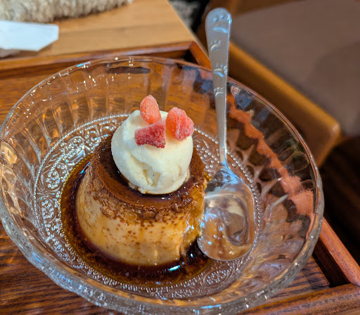 2ヶ月位前に初めて孫と一緒に伺いましたが。 今回2回目は家内と二人で伺いました。 驚いた事に、お店の方が前回の訪問を 覚えて居たらしく。私達が座った席まで覚えて居て、嬉しく思いました。 今回の訪問は、1ヶ月位前から家内と約束してました。 家内は、甘い物が好きなので。 「冷やしぜんざい」と、「カフェオレ」。私は酸味が有るモカが好きなので。 前回と同様の「モカ」と「昔ながらのプリン」を頂きました。 お互いに、ぜんざいとプリンを分け合いながら頂きましたが。 両方共に大変美味しかったです。 特にプリンは私好みで硬めで、甘すぎず、カラメルも程よい苦味が有って満足でした。勿論モカも程よい酸味が有り、スッキリ感も有ってとても飲み易かったです。家内もぜんざいとカフェオレがとても美味しいと満足してました。また家内も二人でお店に行きたいと言ってましたが。 お店の営業日が、木、金、土曜日なので、私の仕事がお休みの水曜日も加え頂いたら。毎月1回位は家内と行けるのにな〜と勝手ですが思いました。 自宅がお店迄、車で15分程度なので。 また。 今回2回目なので、お店の中のインテリア等を拝見する余裕が少し有りました。 靴を脱いで入るので。 スリッパや、スピーカーの取り付け位置や、カウンター周りの雰囲気。 デザートの器や珈琲カップ。 テーブルの上の置物等にセンスの良さが感じら...