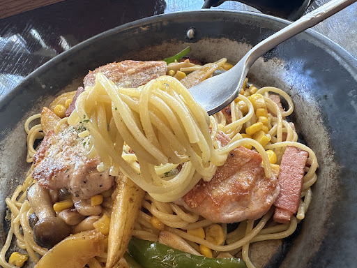Read moreよく前を通るのに、一度も行ったことがなく、初来店で注文に迷っていると、店員さんが、丁寧にメニューを説明して下さったのが有り難く、お冷のレモン水が冷たくて爽やかなので、熱々な鉄板の上にのって、豪快なウエスタン風の生パスタとの相性も抜群でした。