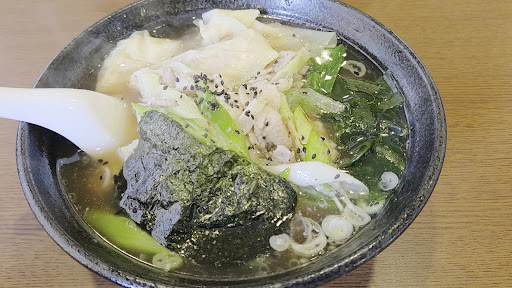 【2025.7】 この店の看板メニュー、十八番らーめんの醤油+ワンタントッピング(3個)をいただきました。いわゆる意識高い系とは真逆の街中華寄りのラーメンで、豚バラとネギをにんにくと共に炒めたラーメンで、さらにわかめと海苔とメンマも通常のラーメン と同様に乗っているので具だくさんで嬉しいですね。 炒めた油がスープの表面を覆っているのでかなり熱々、さらに、にんにくの香りが後を引き、食べ進むほどに益々食欲が湧いてきます。一般的なタンメンとはまた違う、独特の美味しさがあります。 麺に関してはそれほど特徴はなく、ごく一般的な中細のややウェーブ がかった、やや多加水気味のぷりっとした麺。 餃子は、ラーメン屋 にしては珍しく、皮を一枚一枚、綿棒で伸ばしていて、通常よりもやや 肉厚でもちもちしてとっても美味しい。餡は野菜中心のなめらかタイプでかなり 生にんにくが効いているので、食後 仕事がある場合はエチケットのためコーヒーを飲んだ方が良さそうです。 駐車場は店の前 以外に、横にもかなり 台数が停められそうなので、この辺りのラーメン屋...