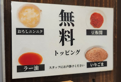 山椒(シビ)と唐辛子(カラ)の量を選べて、オススメの一段下を選んだが十分存在感があった。まあ無くても美味いと思うし、ベストバランスを見つけるには沼りそう。 具は海苔、ネギ、メンマ、チャーシュー。ネギは香りが強くて、チャーシューも薄いけど肉感があり良かった。 紅しょうがは入れ放題。 ラーメンダレが置いてあり、うま味を凝縮した塩ダレの様な感じ。多分塩分が高いので入れ過ぎ注意。
