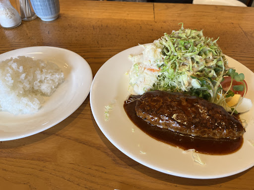 Read moreずっと行きたかった喫茶店☕ カウンタで初めて会った常連さんの話にうなずきながら、マスターの手早い作業に見惚れます。丁寧な作業に職人気質を感じます。 肝心のハンバーグはフワフワ、ナツメグの香りが口いっぱいに広がり、手づくりハンバーグを堪能できます。美味しいのに重くない。 デミグラスソースも深みがある。 ふ~む、自分で作れないなぁ。