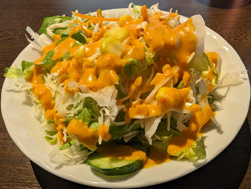 サラダは、きゅうり、レタス、キャベツ、人参、とうもろこしの上に、濃いオレンジ色が鮮やかな人参ベースのドレッシングがかかり、サッパリした味でした。