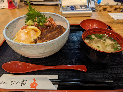 なつ梅丼は、ご飯の上に目玉焼きの他、大葉を敷いたネギトロ、豪快に転がる豚の角煮と、3種の具材が仲良く並んだ丼ぶりでした。