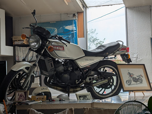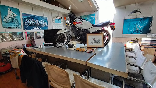 かなり古びた店舗の外観&内観ですが、昔を思い出す懐かしさ。何も変わっていないので安心しました。 お宝バイクが店内にはたくさん!ヤマハRZ、CB400four、その他色々。これら全てエンジンがしっかりかかるそうでバイク1台1台に愛情を注いでいるのが分かります。 テーブルで囲われたRZが鎮座しているスペースは昔はお客さんの自慢のお宝バイクが代わる代わる置かれて、お客さんが色々なバイクを眺めながら喫茶や食事を楽しんでいました(^^)
