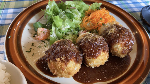 2022年11月3日、木曜日(祝日)、午後2時頃、ふたりで初訪問。 浜松卸本町郵便局の向かいにある、アルラ駐車場に車を停めても良いそうです。 先客がありましたが、いちばん奥のテーブルが空いていたので、座ることができました。 優しい女性スタッフと、男性シェフのふたりで切り盛りされていました。 私たちは、メニュー表から、照り焼きチーズチキン 1320円 と、大きなメンチカツ 1276円 を注文しました。全てのメニューがドリンク付き(コーヒー、紅茶、オレンジから選択)だということで、私たちは、ホットコーヒーとアイスコーヒーを注文しました。 ご飯は、おかわり無料だそうです。 静かなピアノのBGMが流れ、とても落ち着いた感じです。 大きなメンチカツは、スパイシーで、ソースも個性的な感じがしました。 照り焼きチーズチキンは、チーズがたっぷりかかっていて、チキンは柔らかく、美味しかったです。 サラダには、バルサミコドレッシングがかかっていました。 お料理は、個性的で工夫が感じられます。 ありきたりの味という感じは全くしません。 女性スタッフの思いやりのある声かけも温かく感じ、素...