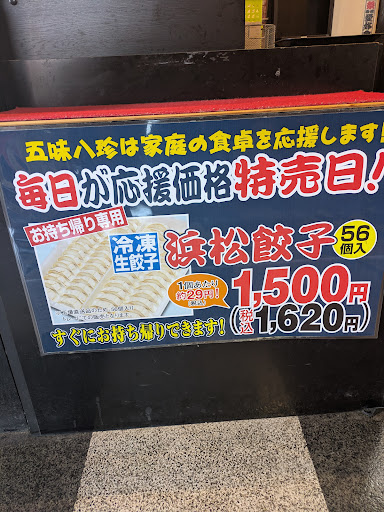 五味八珍さんは、素朴で飽きない味だと思います。ラーメンなど、コテコテばかりが流行る中、このラーメンは貴重です。ふと食べたくなる時があります。 そうそう、ランチなんですが、ご飯のおかわりが自由なんですが…面倒な人は最初からご飯大盛と言えば大盛にしてくれますよ🎵ですのでランチ時、ご飯をたくさん食べるは最初からご飯大盛で🎵と言ってみて下さい! そうそう…最近知った事があります! 毎週火曜日と土曜日がお持ち帰り餃子がめちゃめちゃ安くなります! ほとんど半額に近い! 普通は1トレー(56個だっけな?)2000円ぐらいなのに、火曜日土曜日は1100円! つまり、1個35円→19円!! これ…不思議なんですよ…1個35円の五味八珍の餃子…って思うと…なぜか美味しく感じない(涙)こんなものか?って思ってしまうのです… しかし!!~1個19円だと思うと…めちゃめちゃ旨い!!最高の餃子に生まれ変わります☆人間の心理でしょうか? 久しぶりに安くて美味しい餃子を味わった感覚です(*´∀`) 五味八珍さん、是非!!お願いします! 1トレー1000円で販売してください! 1トレー1000円ならば浜松最強餃子...