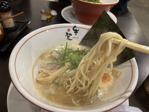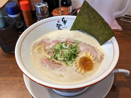 Read more浜松市の国道257号東海道沿い、可美中学校にほど近く、スズキ本社の正面玄関を出て真っ直ぐ行った突き当たり付近にある。隣は24時間の餃子販売店で結構目立つ。 比較的珍しい牛骨ラーメンの店。入店すると先に食券をどうぞと案内される。豚より牛の方が材料が高いからだろうか、牛骨ラーメン1120円とまあまあのお値段になる。思わずギョッとしたが、次いつ来れるかわからない店なので特製牛骨ラーメン1260円を選択。足りないのを見越して替え玉の食券も購入、しめて1460円。 店員さんに食券を渡すと、醤油、塩、味噌どうされますかと聞かれたので、同僚推しの味噌を選択。5分ほどで到着。 ラーメンスープは牛骨出汁が濃いからか味噌は感じず、まるで天下一品のよう。細麺にスープが非常によく絡むので、替え玉の前にスープがなくなりそうな勢い。調味料は自家製のラー油、グラインダー付きのブラックペッパー、一味唐辛子、昆布酢、フライドガーリック。替え玉の際に味変として入れさせてもらったが、自家製ラー油はなかなかヤバいほど辛く、入れ過ぎ注意。残ったスープに昆布酢を入れて、最後の一滴まで飲み干させてもらった。 店内店外、豚骨ラーメン店のようなにおいはしない。席数は卓とカウンター合わせて10席ほどと少ないものの、店内は余裕を持たせた空間。次回機会があれば、和え玉という味付き...
