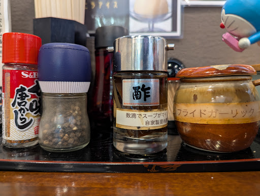 カウンターにつくと、目の前には自家製ラー油、ブラックペッパー、昆布酢、フライドガーリックといった調味料が並びます。 目の前の壁はそれなりの高さがあり、その上の開口部にも暖簾がかかっているため厨房の様子は見えず。まあこちらが食べてる様子も見られなくて済むので、個人的にはこういうほうが好きです。