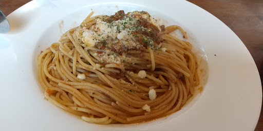 Places like this you often cant go wrong. It's a salad bar buffet of mainly salad items, bread and a kind of tapas. The drinkbar is small but the coffee topping options are impressive. Pastas are quite large! The tomato based pasta was oomori, but the cream pasta was regular. Look at the picture, big right? And well, it was delicious. Around the quality of an ordinary italian restaurant better than Jolly Pasta. Price around 1200 to 1350 yen for pastas. Considering the salad and drink bar, that is...