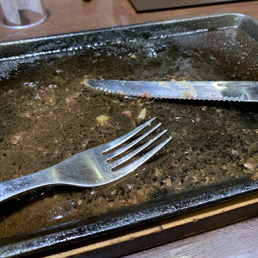 和牛リブロース乱切りステーキは、玉ねぎ、和牛リブロースのステーキ、ガーリックチップが、鉄板の上でジュージューと音を立て、付け合わせに、とうもろこし、人参、ブロッコリーが付いて、ゴロゴロした乱切りのお肉は、ほぼ素焼きの状態らしく、いきなりソース(甘口)や黒胡椒を付けて食べるそうで、歯応えが強く、肉肉しい印象のリブロースは、写真を撮ってみると、鉄板が大きくて… お肉が小さく見えましたw
