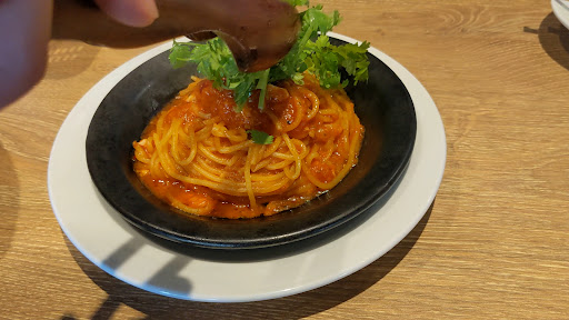 悪魔パスタは、辛さが選べ1HOTでピリ辛にしたら、パスタの上に唐辛子が丸々1本のってました。麺は生パスタとのことですが、極太でなく、中太のモチモチした麺で、ソースに入っている細切りのニンニクとピリ辛の味が、合っていました。