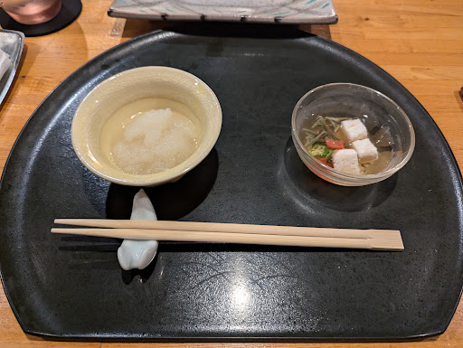 お通しは、店員さんに聞くと「じゅんさいと山芋」とのことで、冷たいゼリー状のダシに漬かった蓴菜、オクラ、ミニトマト、そして、白いコロコロした山芋と思いきや…白いのは、お豆腐だそうで、口の中でホロホロと崩れるような食感が不思議で、んー?じゃぁ山芋はどこに?となりながら食べました。