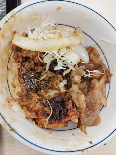 豚汁は、白だしの中に、大根、人参、じゃがいも、こんにゃく、玉ねぎ、刻みネギ、豚肉が入って、シャキシャキしたネギに加えて、たっぷりの野菜は、ゴロッとして食べ応えがあり、白だしに溶け込んだ豚バラ肉の旨味が、少し甘めな白味噌との相性がよく、具沢山な豚汁を楽しめました。