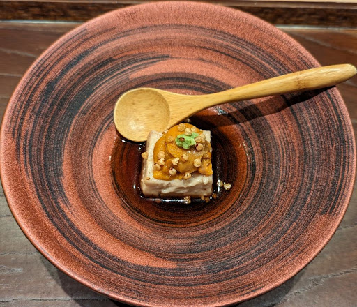 胡桃豆腐をいただきました。 蕎麦つゆに、 くるみを使った豆腐を入れ、 その豆腐に北海道産の雲丹、 静岡県産のわさびをのせた逸品。 蕎麦の実を周りにちらしているのが、 ワンポイント。 初めて、胡桃の豆腐を いただきました。 新食感に出会えて、 し・あ・わ・せ。 毎月違う味の コース料理に出す豆腐を 考案していると 大将がおっしゃってました。 なので、楽しみの一つとなってます。