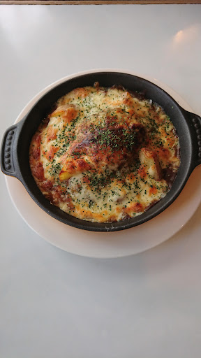 ハンバーグオニオントマトは、主役の(はずの)ハンバーグを土台に、厚みのあるオニオン、まるっとトマト1個が積み重なり、全体にデミグラスソースで、見た目が豪華な一皿で、全品黒毛和牛使用と説明されたハンバーグは、牛と豚の黄金バランスで作られているらしく、他にも地産地消などのコダワリが、ギュッと詰まったハンバーグなのだそうで、玉ねぎのシャキシャキと、トマトの瑞々しさが堪りませんでした。