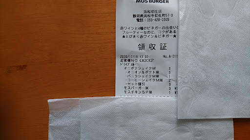 紅茶を注文したところ、テーブルに持ってきてくれた時にはティーバッグが無い状態だった。いろいろなモスを利用しているがティーバッグを取ってから持ってきてくれた経験はははじめてだ。紅茶はちゃん抽出されていたので美味しくいただけた。 おしぼりをお願いしたところ、いわゆるモスマークの入ったモス標準おしぼりではなく汎用品のおしぼりであった。汎用品はモスおしぼりよりやわらかでいい感じで使えたのがよかった。