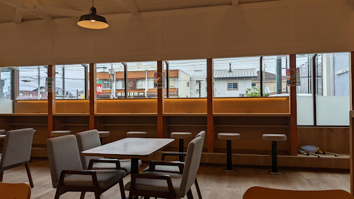 飲食スペースは広びろとして開放感があって全体的にキレイな感じ。店内に配置されている什器は新しく清潔感がある。天井が高く店内が広く感じ、テーブルの間隔が広く取られていてよい。駐車場に面する窓側はカウンター席が8席あり電源が取れるためPC、スマホ使いには使いやすい。奥にある洗面所はキレイでトイレも広くてよい。食べ終ったトレイは入口横の棚にトレイごと置いていくスタイル。 棚の下に飲食後の袋やプラカップを捨てるゴミ箱は無い。