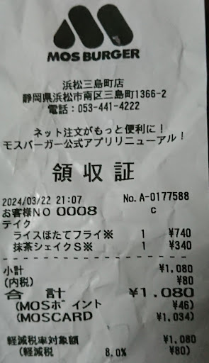 残念なのは、たいていのモスに置いてあるモスおしぼりを置いてないこと。店員さんに聞いたら洗面所で手洗いしてとのこと。残念。是非他店同様にモス...