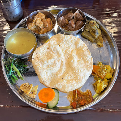 初のネパール焼酎も美味しかったー! また来ます! 〜R7年3月 ダルバートのお店がオープンすると知って、ワクワク!オープン2日目に来店。 もしかしてと思ってたら、やっぱり近くの大好きなロータスさんのお母さんのお店でした。 チキンカレーの付いたバート1,100円。チャパティ200円を追加、食後のホットチヤ(チャイ)300円もオーダー。 限定5食のターメリックライス、13時過ぎだから無いだろうと思ったら、オープンの日に人気だったのでたくさん仕込んでくれたらしく、食べられました。 あっさりして、野菜もたくさんで、日替わり定食好きな私にピッタリ! 細かい骨付きのチキンが美味しい!でも、お子さんやお年寄りは気をつけて。 日本の若い方がこのお店のオープンに奮闘してくれたらしく、感謝!